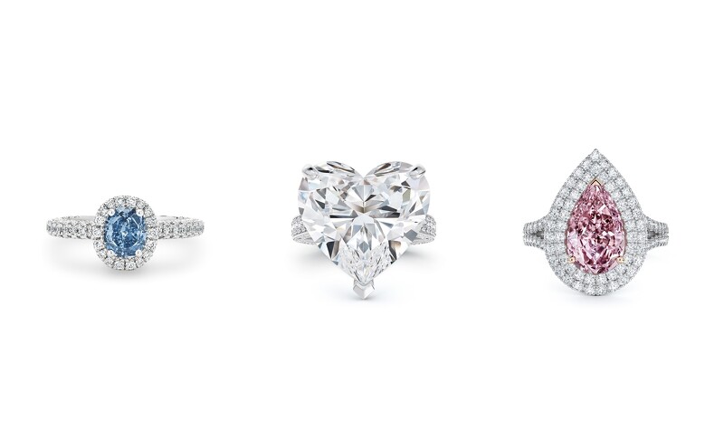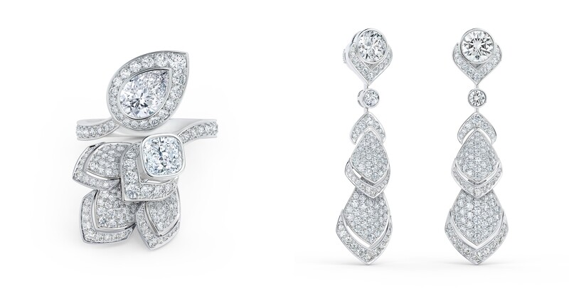 Aura 高级珠宝枕形切割蓝钻戒指,主钻为0.62克拉艳彩蓝钻;DB Classic 高级珠宝心形切割钻石密钉镶钻戒指,主钻18.03克拉;Aura Double Halo 高级珠宝梨形切割粉红钻戒指,主钻为2.13克拉浓彩带紫色的粉红钻。 重点4:不朽设计源于大自然的创意灵感