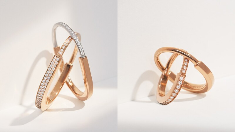 (左至右)Tiffany Lock 18K玫瑰金舖镶钻石戒指、Tiffany Lock 18K玫瑰金戒指、Tiffany Lock 18K金半铺镶钻戒、Tiffany Lock18K白金全铺镶钻戒。 备受名人爱戴的话题珠宝 时髦风格的人气指标